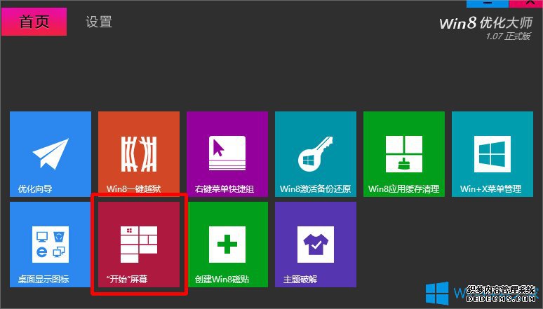 1、下载Win8优化大师轻松定制Windows开始菜单,进入主界面这里我们可以看到几项Win8相关优化,我们选择“‘开始’屏幕”选项进入。