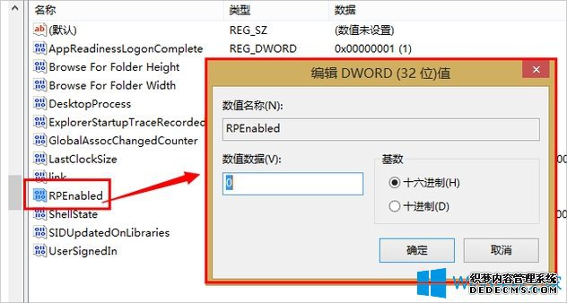 4、在Explorer右侧栏找到RPEnabled,将其值从1改为0即可。